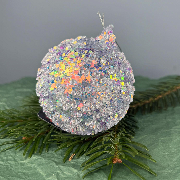 Серебряная стеклянная капля, усыпанная кристаллами и голографическими блёстками — это не просто украшение, а настоящий акцент на вашей ёлке. Идеальна для тех, кто ценит изысканность, блеск и атмосферу праздника.