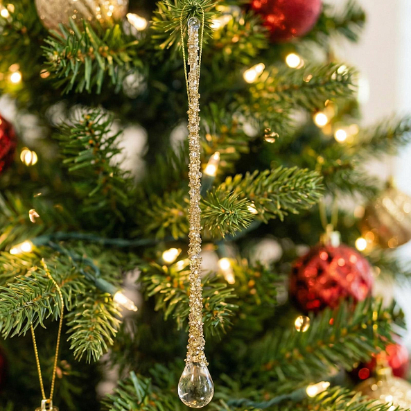 Длинная стеклянная сосулька, усыпанная золотым глиттером — не просто украшение, а настоящий акцент на вашей ёлке. Идеальна для тех, кто ценит изысканность, блеск и атмосферу праздника.