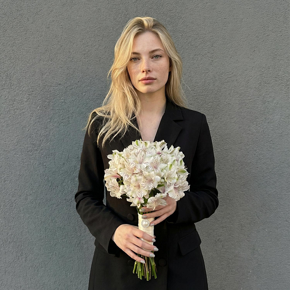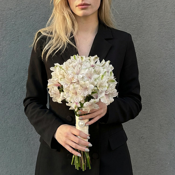 Белая альстромерия с нежными прожилками — это не просто цветы, а символ чистоты, любви и долгой жизни вместе. Идеален для невесты, которая ценит простоту, доброту и гармонию.