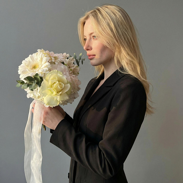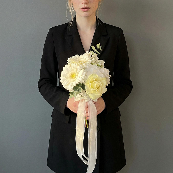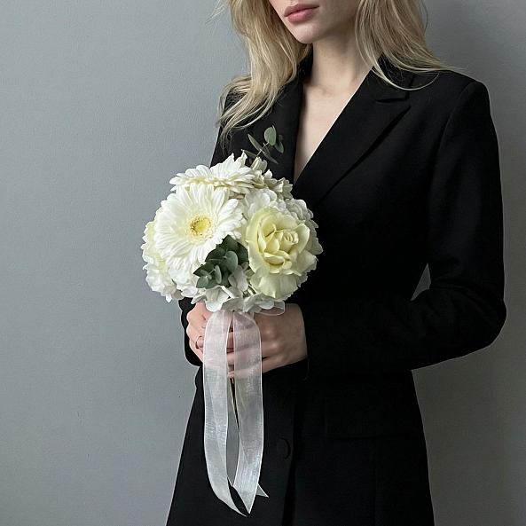 Свадебный букет. Гортензия, Гербера, Альстромерия, Роза Белая "Атена", Эвкалипт.