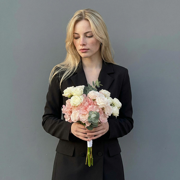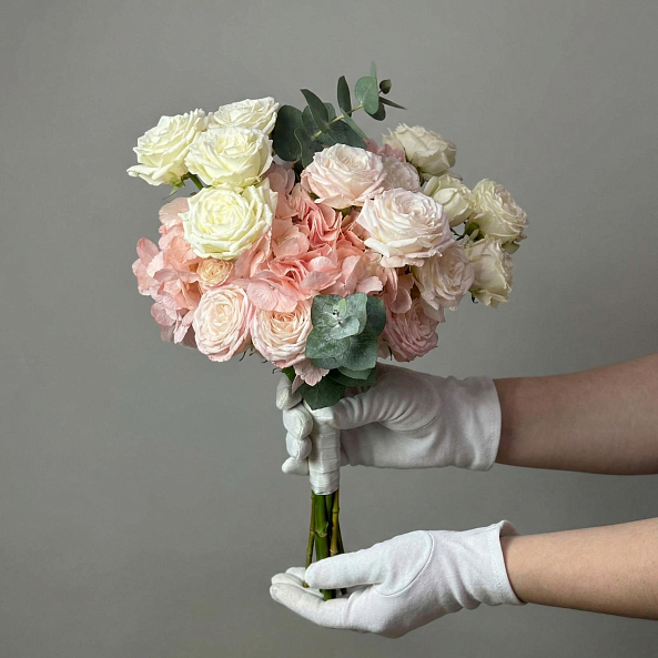Свадебный букет. Гортензия Нежно-Розовая, Кустовая Пионовидная Роза, Эвкалипт.