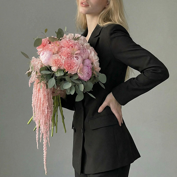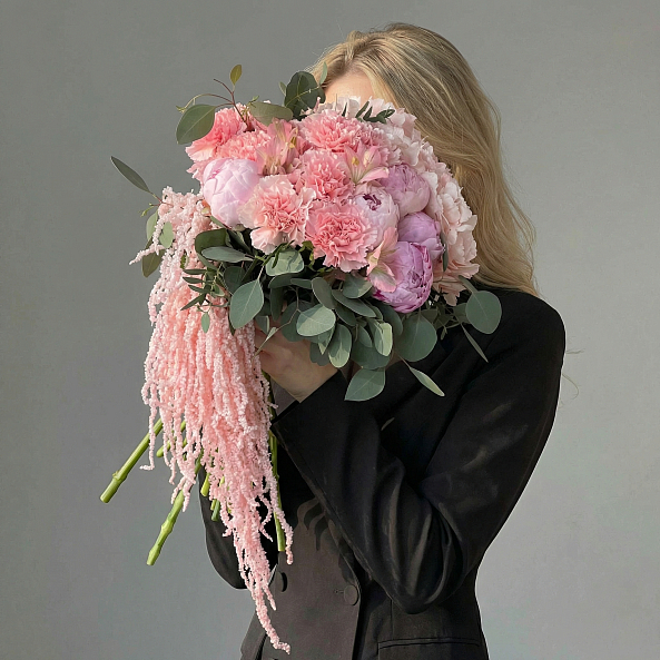 Для воздушности и динамики мы добавили пушистые розовые амаранты, создающие эффект «водопада» и придающие букету современный шик. Свежесть и контраст обеспечивают серебристо-зеленые листья эвкалипта, которые не только украшают, но и наполняют ароматом.