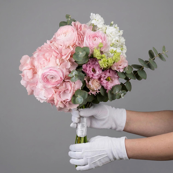 Свадебный букет. Гортензия, Ранункулюс (Лютик), Эустома, Маттиола, Эвкалипт.