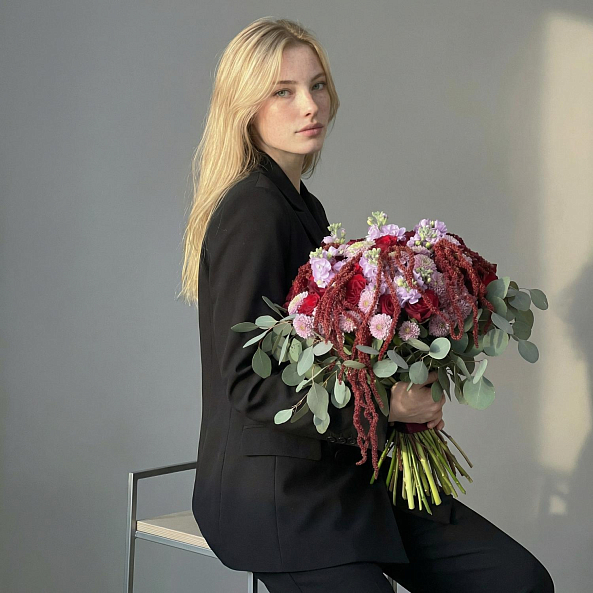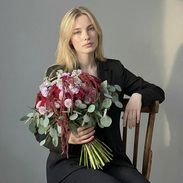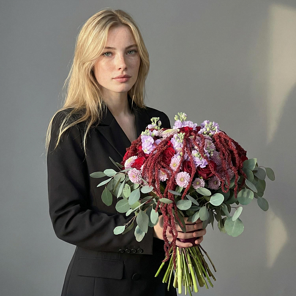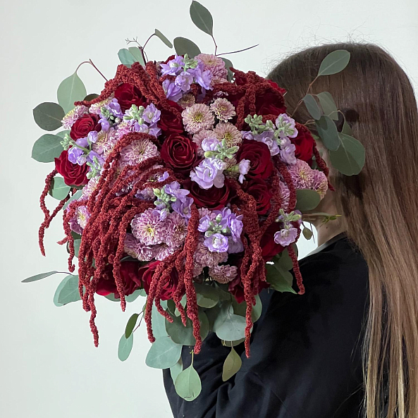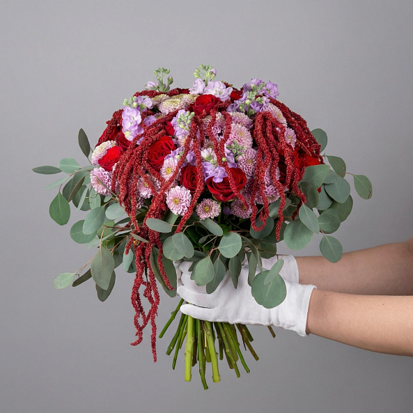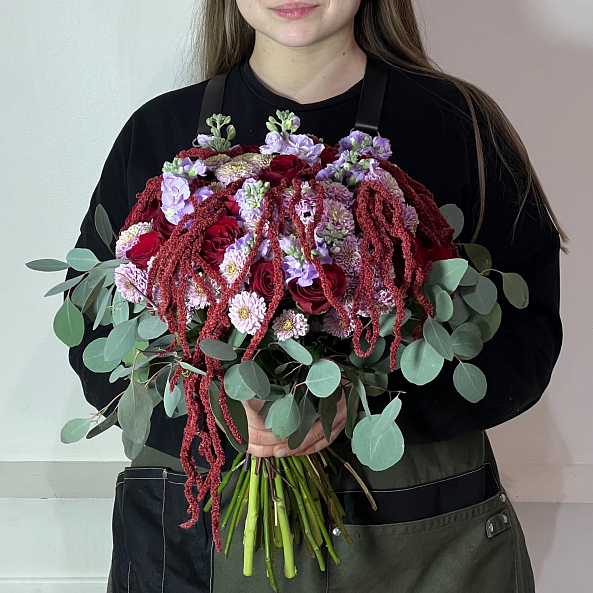 Текстура и контраст — свежий эвкалипт, пушистый амарант, нежная маттиола и мелкие сантини добавляют динамику, аромат и визуальный интерес.