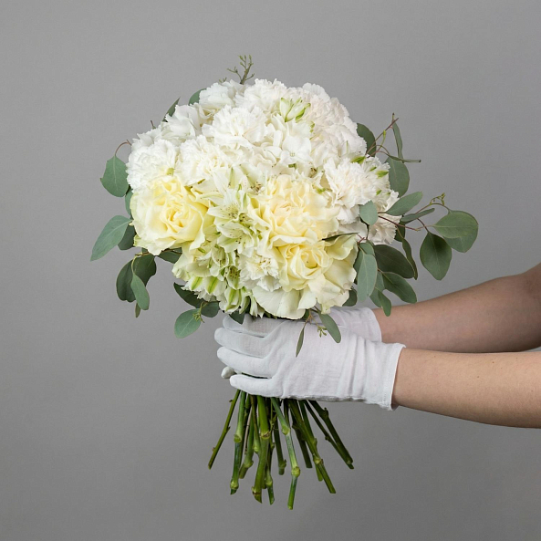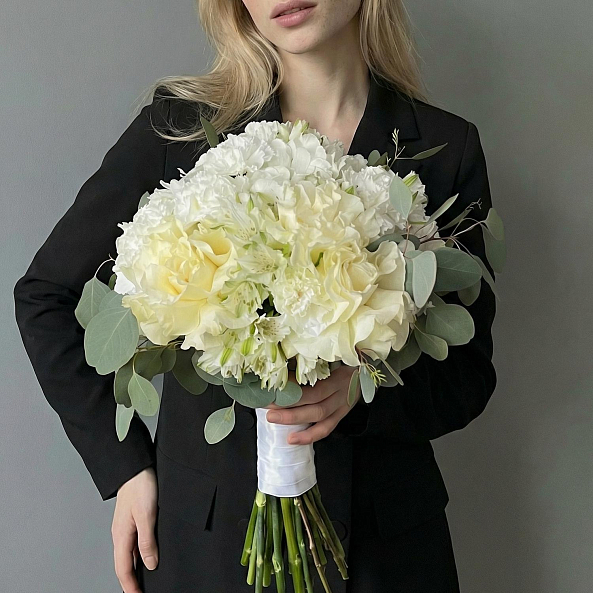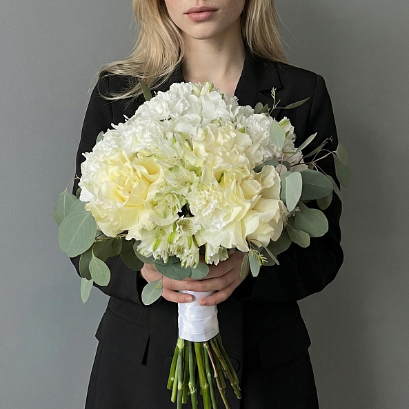 Свадебный букет. Роза Французская Белая "Мондиаль", Гортензия, Альстромерия, Диантус, Эвкалипт.