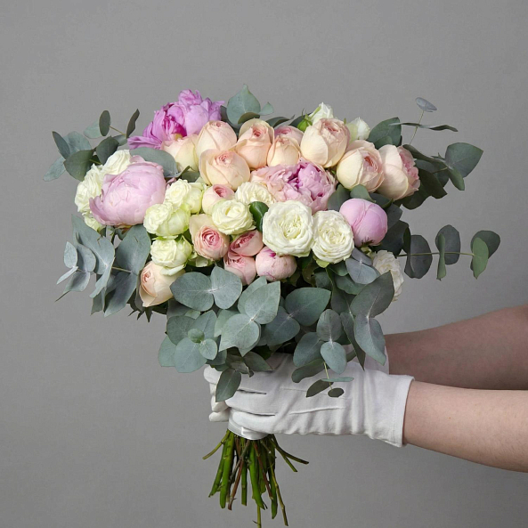 Этот букет — воплощение изысканной классики и современной элегантности, созданной для самого важного дня в жизни. В композиции гармонично переплетаются пышные пионы в нежно-розовых оттенках, кустовые розы кремового и белого цвета, символизирующие чистоту и нежность, и свежие веточки эвкалипта, придающие композиции естественную гармонию. Каждый лепесток, словно созданный для того, чтобы подчеркнуть красоту невесты, становится частью истории, которую вы будете вспоминать всю жизнь.