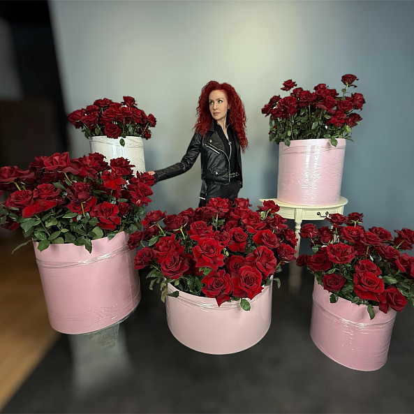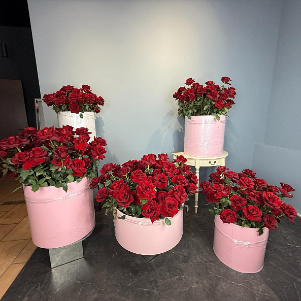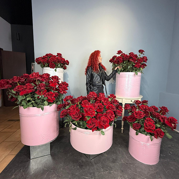 Цветовая гамма бордовых роз создает уютную и теплую атмосферу, а их аромат наполняет пространство сладостными нотами. В сочетании с разнообразием форм цилиндров, эта цветочная композиция станет изюминкой вашего интерьера, добавив в него шарм.