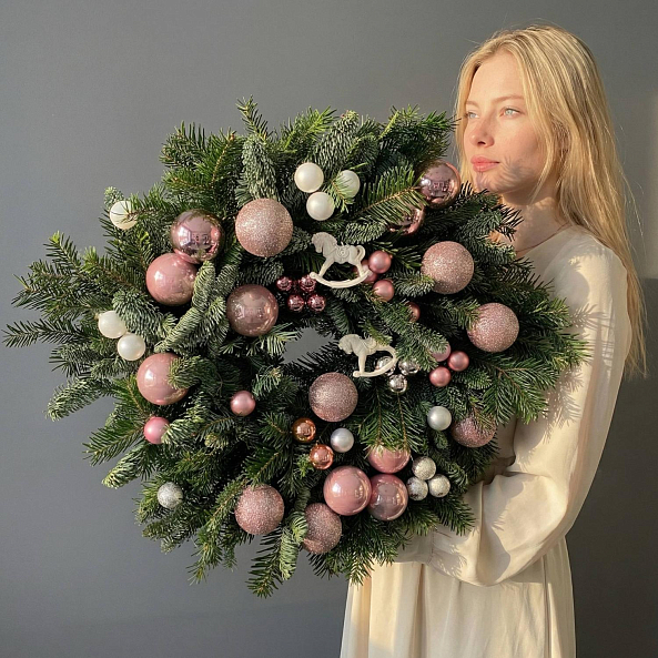 Пышный венок из свежей хвои, украшенный розовыми и перламутровыми шарами, — это не просто украшение, а целая атмосфера зимнего уюта. Идеален для дома, офиса или в качестве подарка.