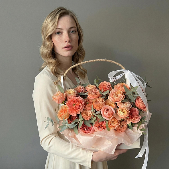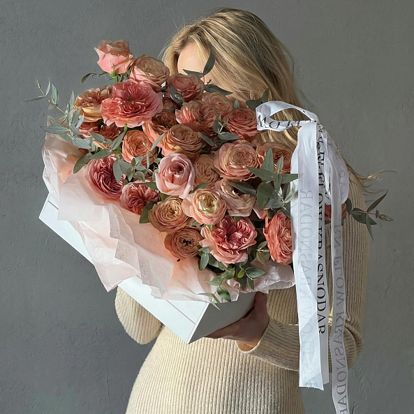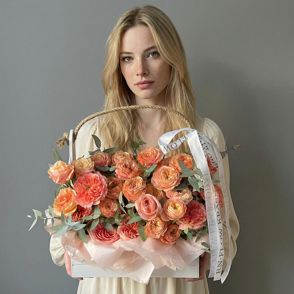 Этот ящик — настоящий подарок для ценителей изысканности. В нем собраны пышные пионовидные розы двух сортов: нежно-персиковые «Леди Априкот» и теплые оранжево-розовые «Лондон Ай». Каждая роза обладает плотной, многослойной чашей, напоминающей пион, и дарит ощущение роскоши при каждом взгляде. Свежий эвкалипт добавляет композиции объем, аромат и легкую воздушность, подчеркивая утонченность букета. Цветы аккуратно уложены в стильный деревянный ящик — он не только служит упаковкой, но и становится частью подарка. Ящик можно оставить как декор для дома или использовать по хозяйству, а цветы легко достать и поставить в вазу, чтобы продлить их свежесть.