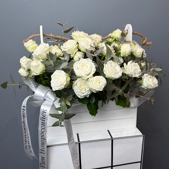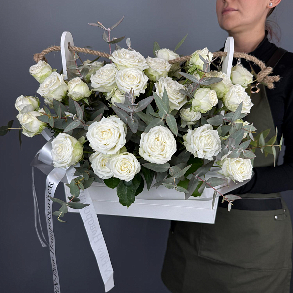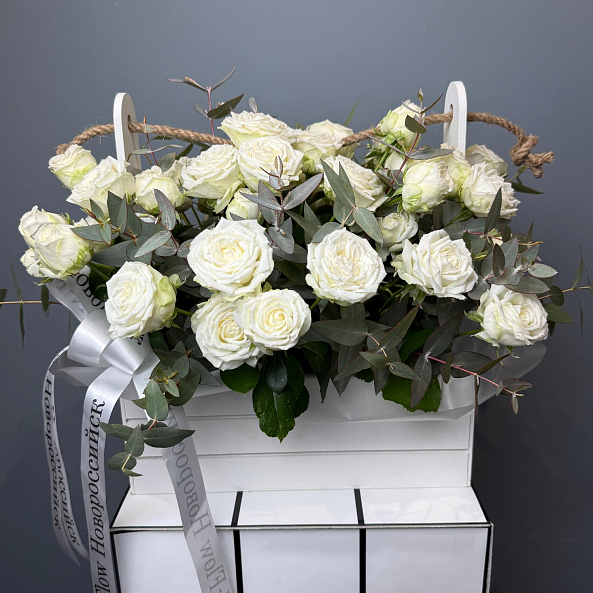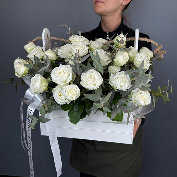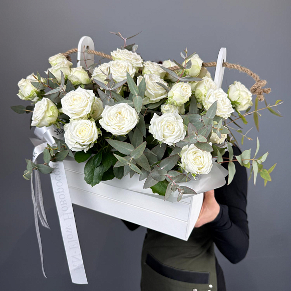 Ящик «Чистая элегантность» — Белые кустовые розы + Эвкалипт