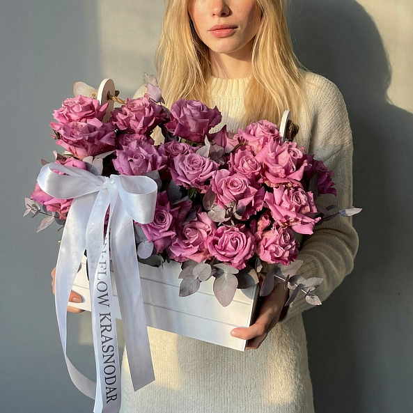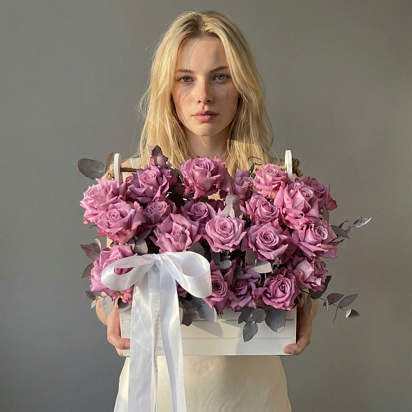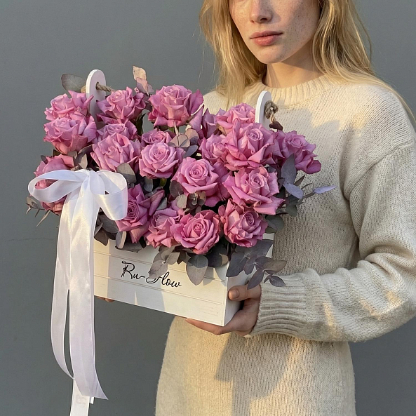 Ящик «Фиолетовая мечта» — Розы «Найтингейл» + Эвкалипт