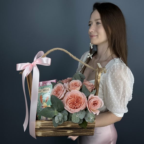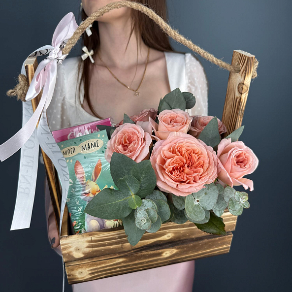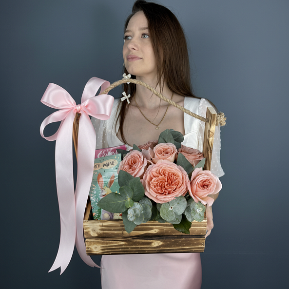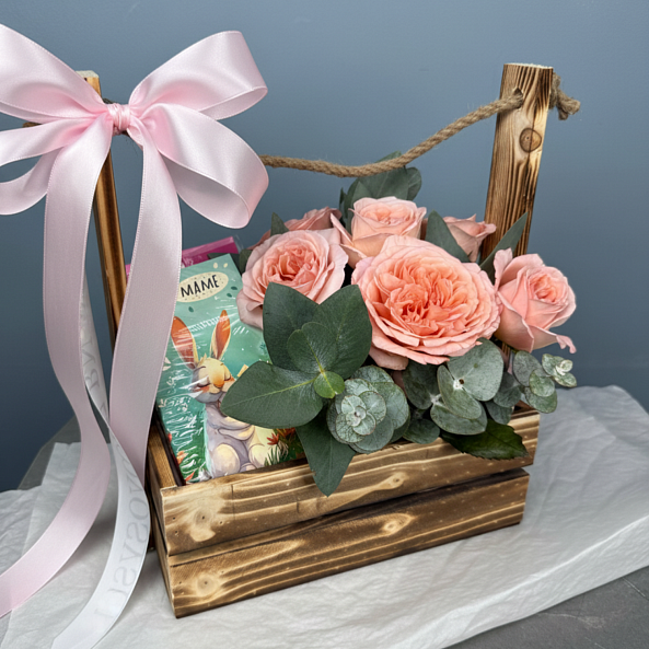 Уютный и трогательный ящик для мамы: нежные пионовидные розы в пастельных тонах, свежий эвкалипт и приятные сюрпризы — чай и шоколад. Упакован в деревянный ящик с розовой лентой — идеальный подарок, который дарит не только красоту, но и заботу, тепло и уют.