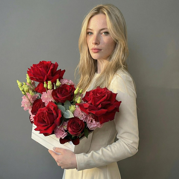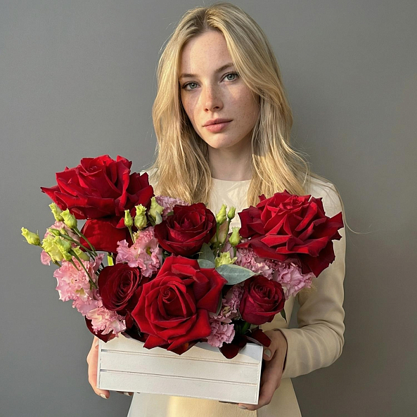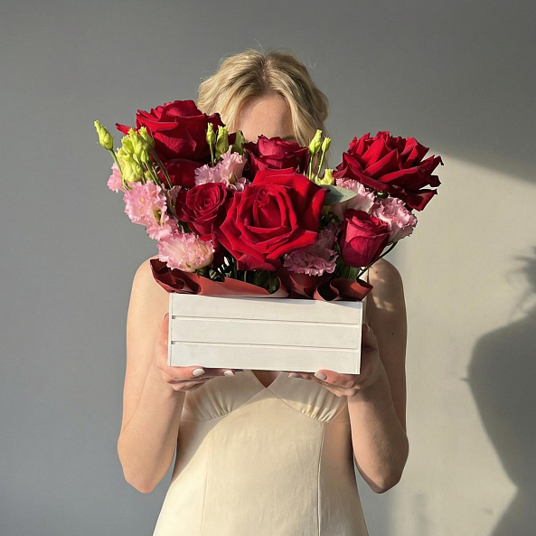 Этот ящик — настоящий подарок для ценителей глубины и изысканности. В нем собраны роскошные французские розы «Эксплорер» с насыщенным бордовым оттенком и идеальной формой бутона, которые символизируют страсть и утонченность. Их дополняют нежные розовые махровые эустомы — они добавляют композиции воздушности, романтики и легкой игривости. Яркие красные розы «Мадам Ред» придают букету силу и выразительность, создавая контраст, который невозможно не заметить.