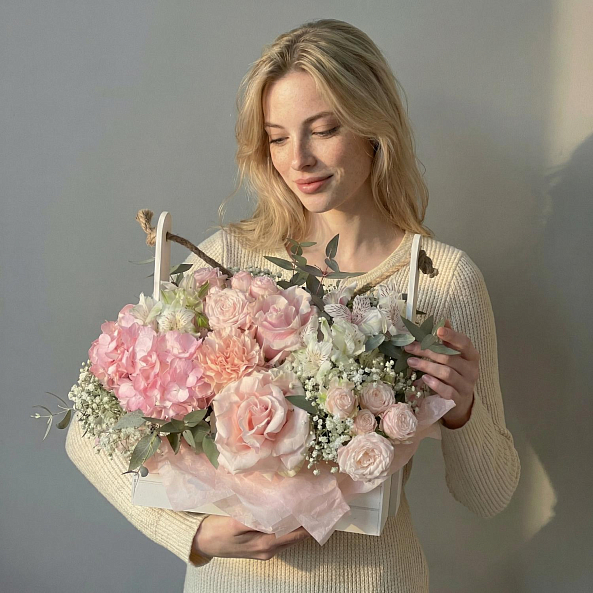 Гортензия, французские розы, белая гипсофила, пионовидные розы, альстромерии и эвкалипт — это не просто букет, а целая история. Идеален для тех, кто хочет подарить не просто цветы, а целое настроение.