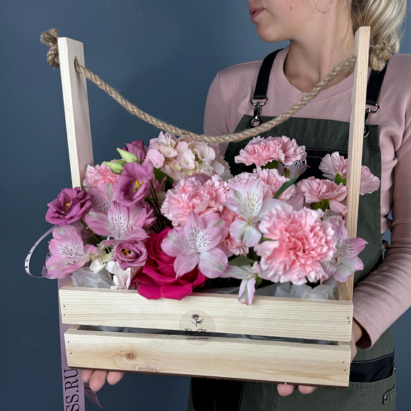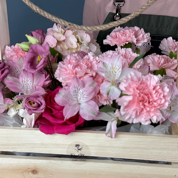 Ящик с цветами. Гортензия Нежно-Розовая, Роза "Фулл Монти", Альстромерия Розовая, Эустома Розовая, Гвоздика (Диантус).