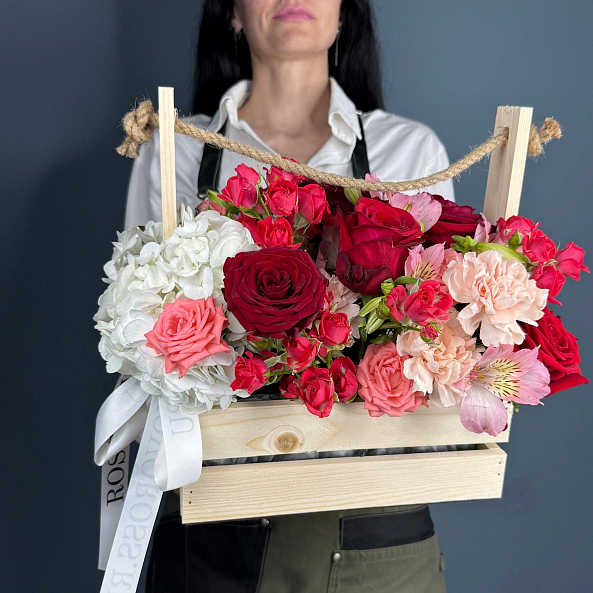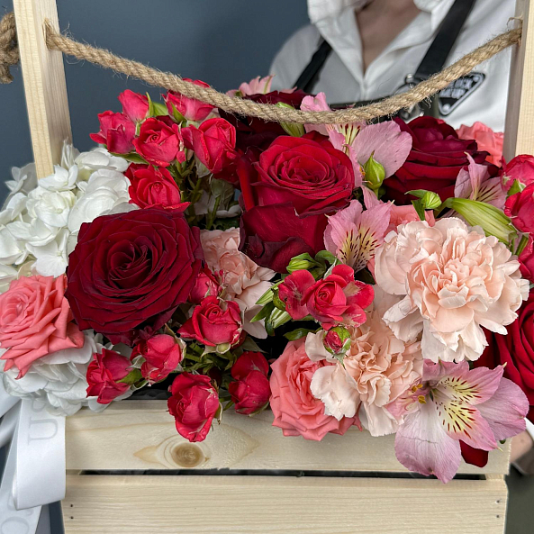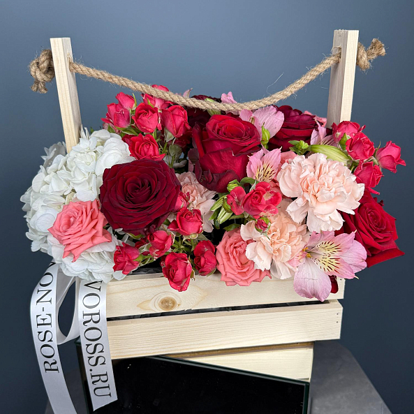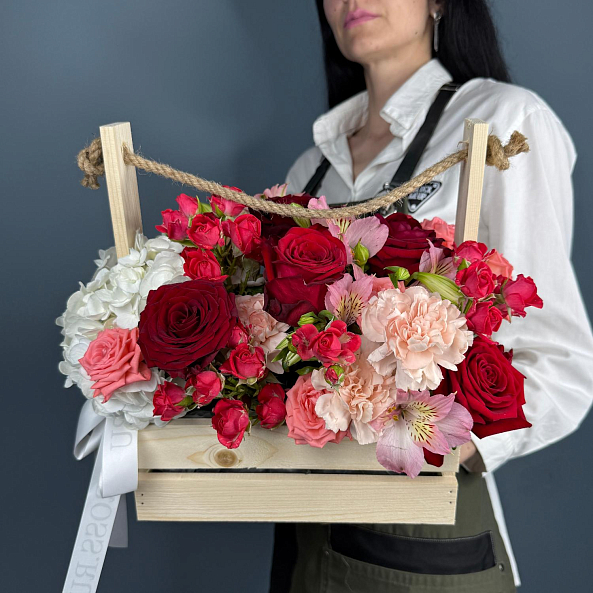 Ящик с цветами: кустовая роза "Барбадос", "Чери Хеопс", белая гортензия, кремовая гвоздика (диантус), роза "Ред Наоми" и розовая альстромерия — это яркая, разнообразная и эмоциональная композиция, сочетающая в себе нежность, страстность и элегантность. Идеальный подарок для праздников, романтических поздравлений или как трогательное выражение любви и восхищения.