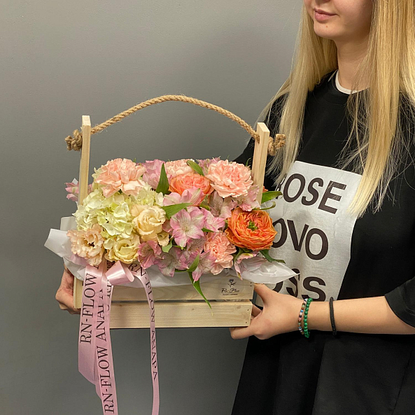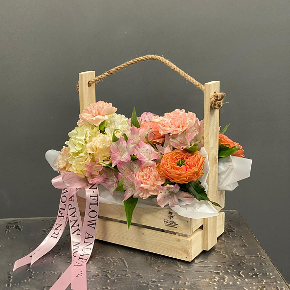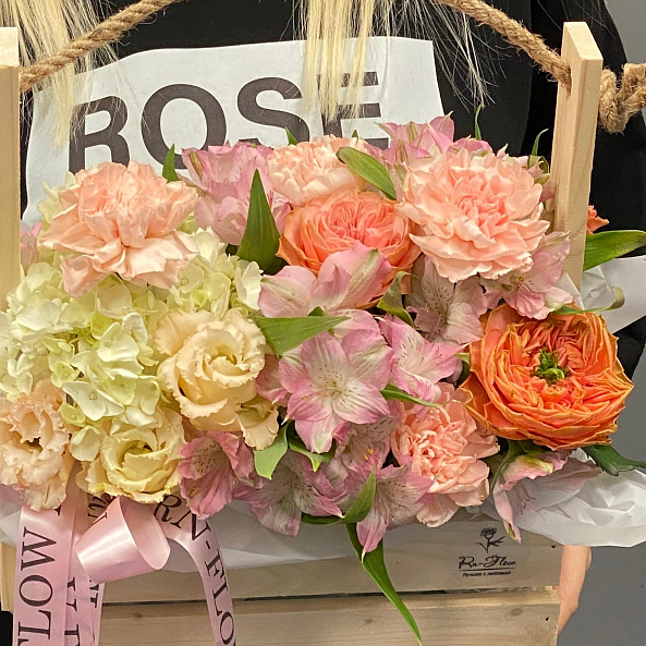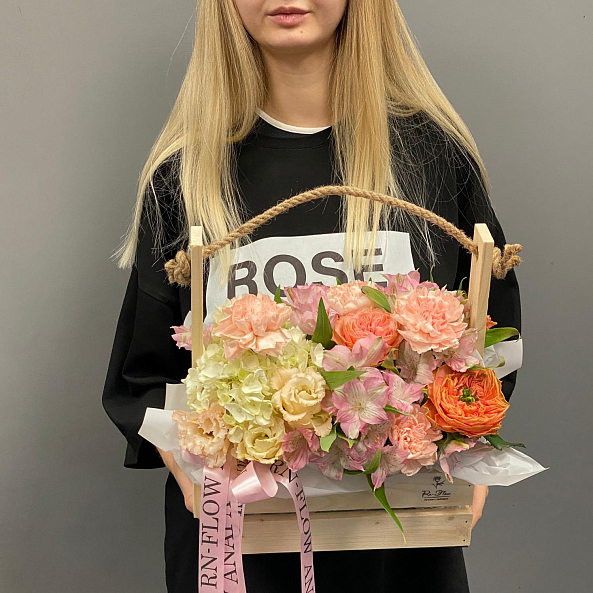 Тёплая и пышная композиция в деревянном ящике с верёвочной ручкой — сочетание нежности и уюта. Яркие пионовидные розы "Леди Априкот" с персиково-оранжевым оттенком становятся главным акцентом, гармонично дополняемым пышной гортензией и розовой альстромерией.